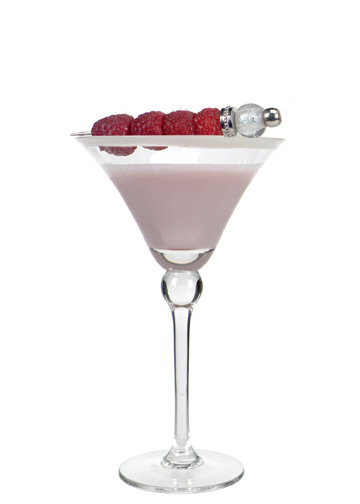 - Pour into a chilled cocktail glass, rimmed with white chocolate, add a spear of fresh raspberries, and serve.